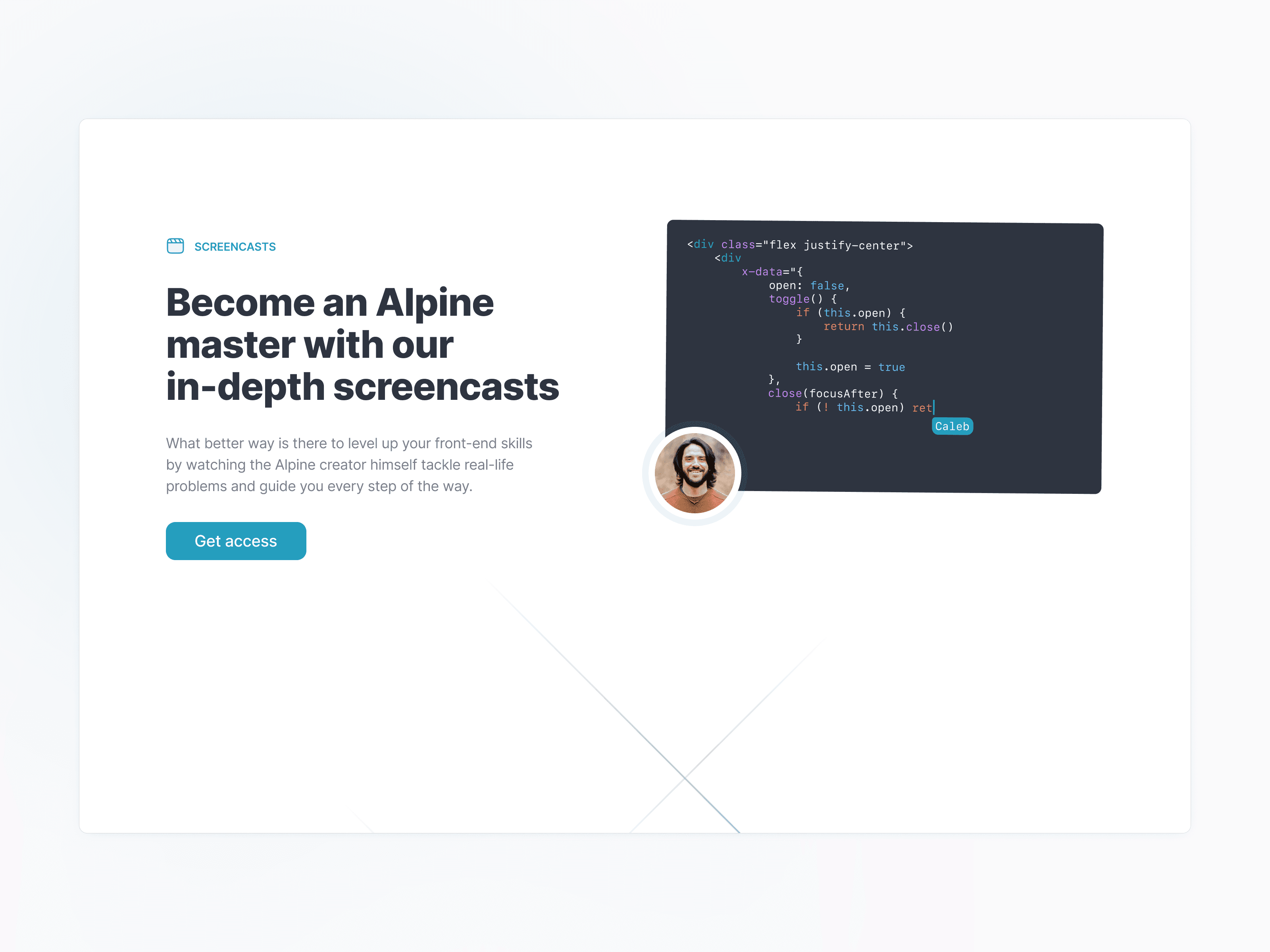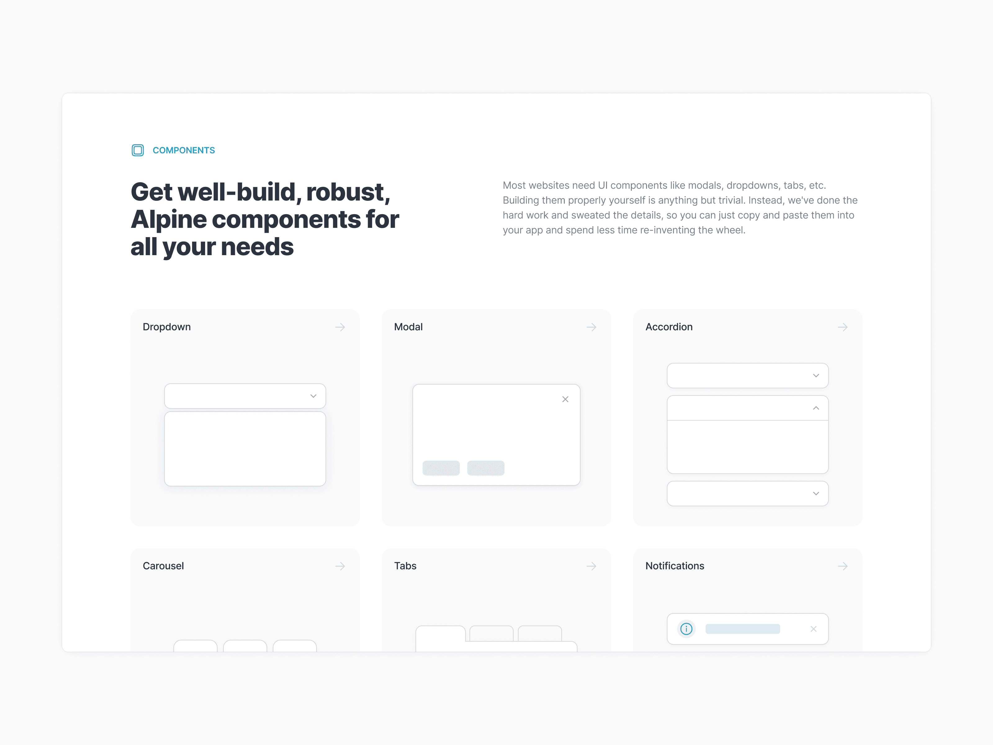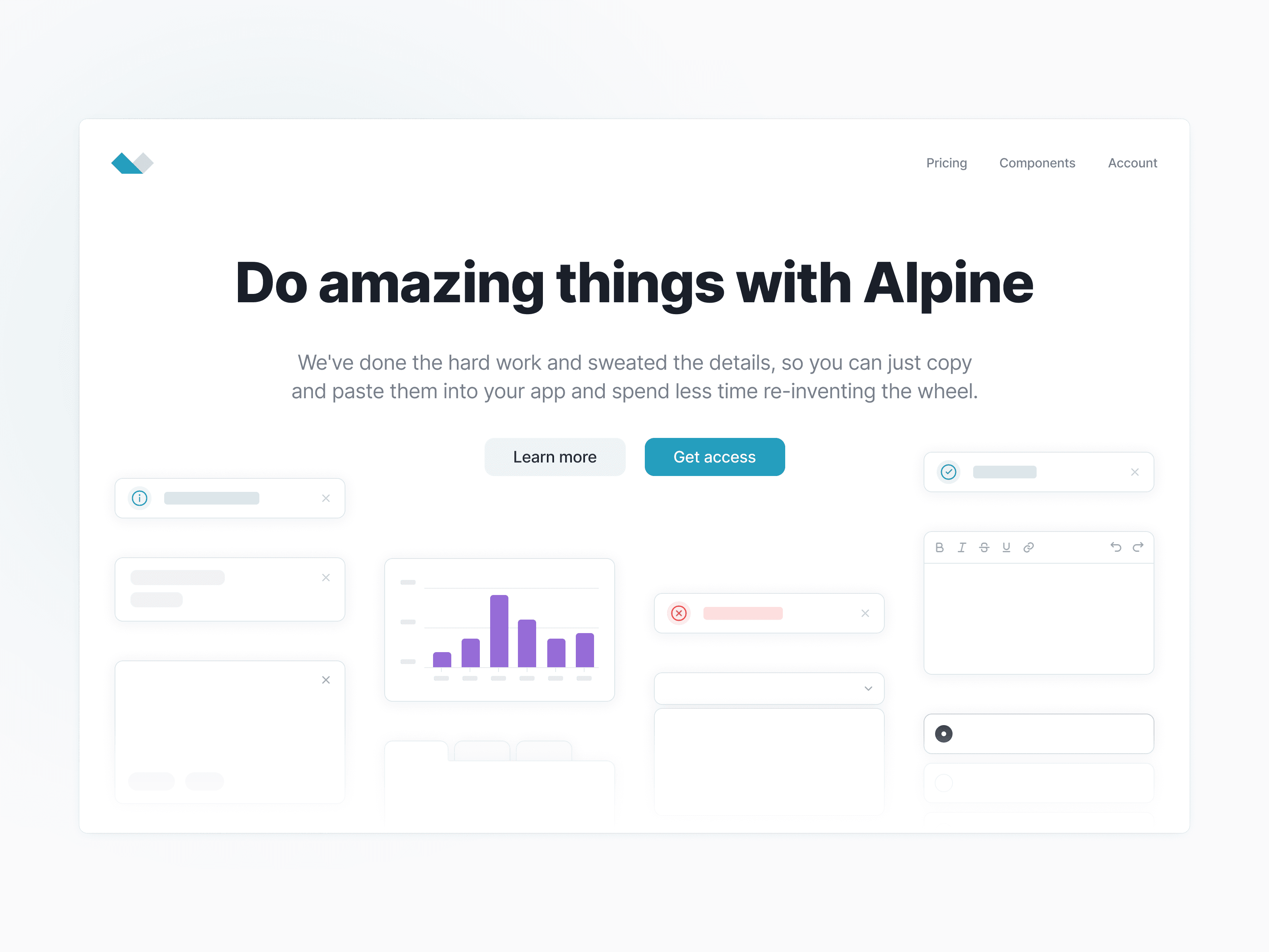 Alpine Components is a project by Caleb Porzio, creator of Alpine.js framework. It comes with pre-built foundational components that developers can just copy paste into their project. They can also leverage deep-dive videos on best practices when working with Alpine. We worked with Caleb on the marketing website and visuals for all the components.